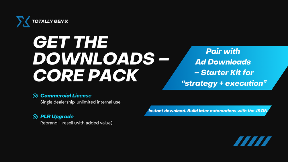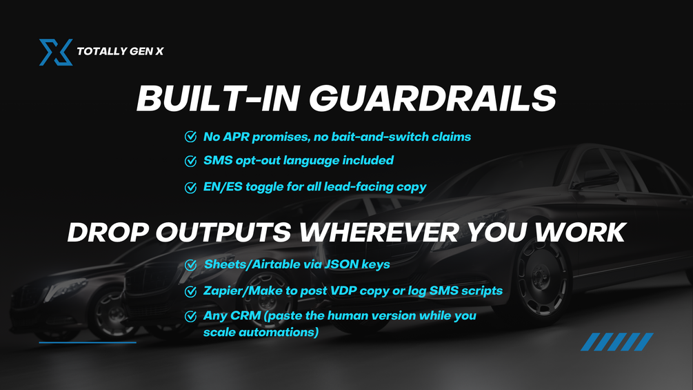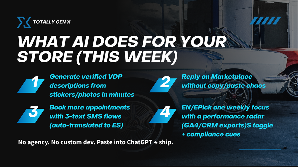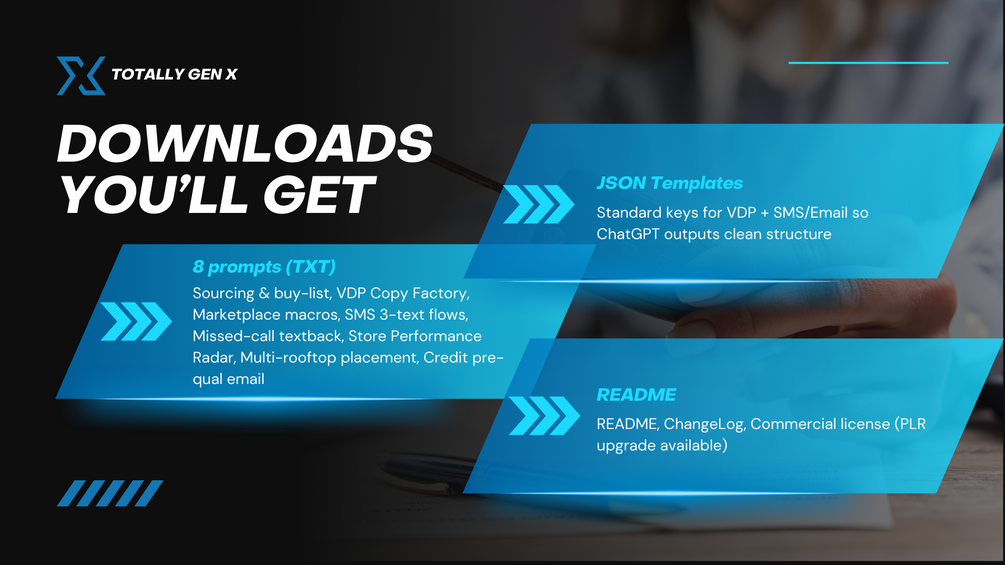 • 8 TXT prompts: Sourcing & buy-list, VDP Copy Factory, Marketplace macros, SMS 3-text flows, Missed-call textback, Store Performance Radar, Multi-rooftop placement, Credit pre-qual email