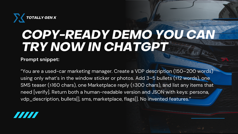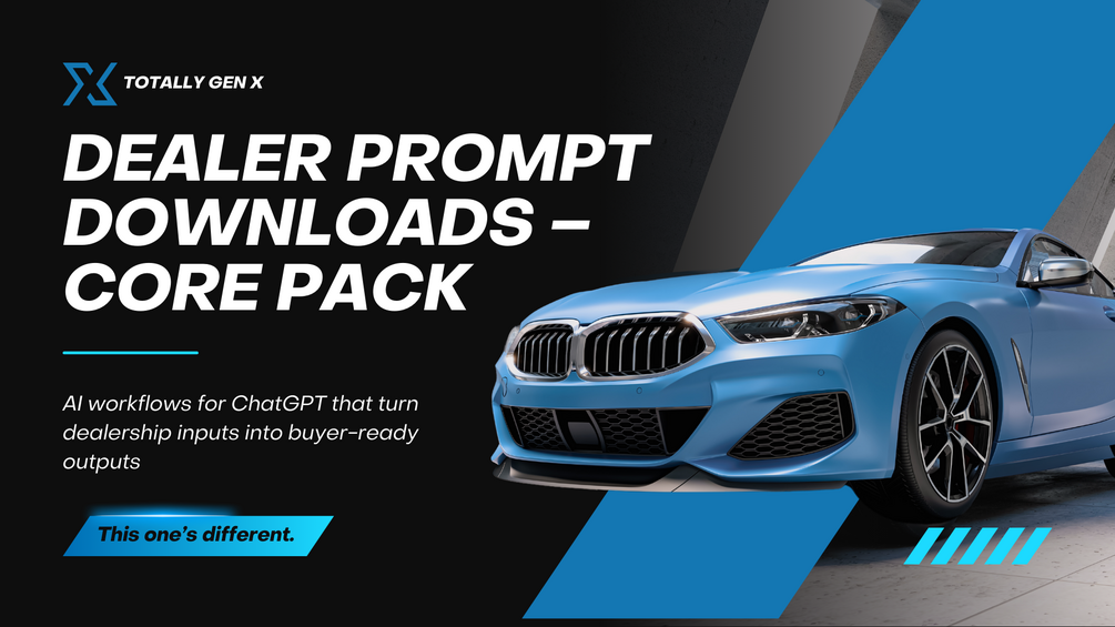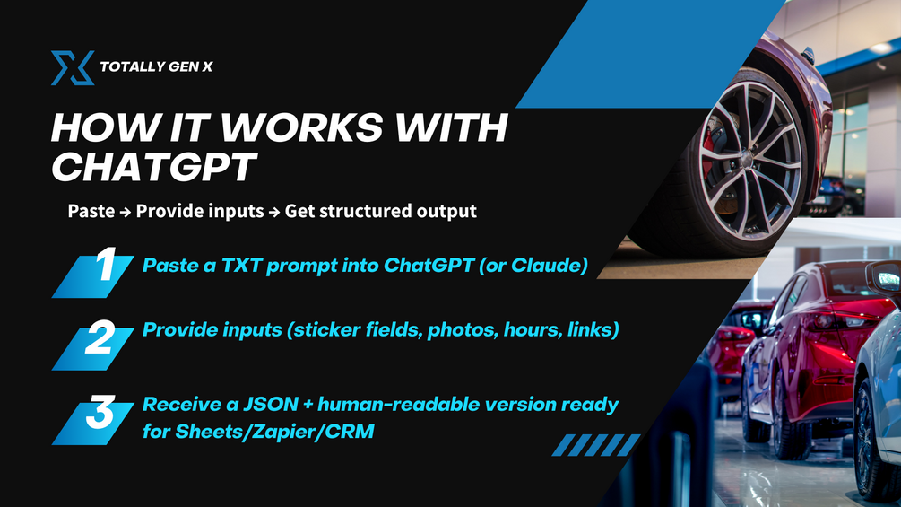 Build dealership-ready outputs with AI. Paste these prompts into ChatGPT (or Claude), provide your sticker/photo inputs, and instantly get verified VDP descriptions, 3-text SMS flows, Marketplace replies, a Monday performance radar, and more—plus JSON schemas for clean automations.