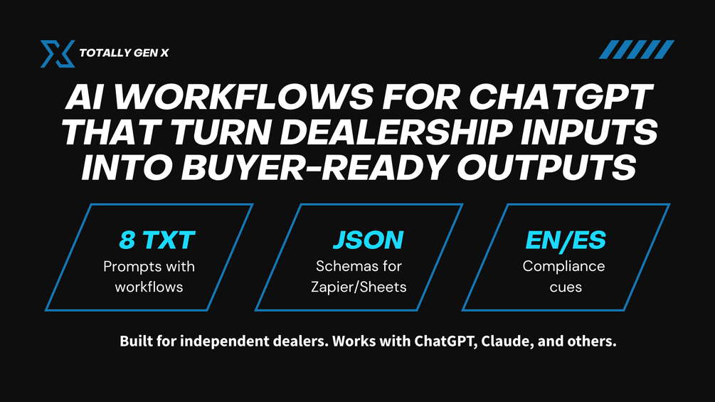 AI/ChatGPT workflows for independent car dealers: VDP copy, SMS flows, Marketplace replies, radar, and more. JSON schemas included.