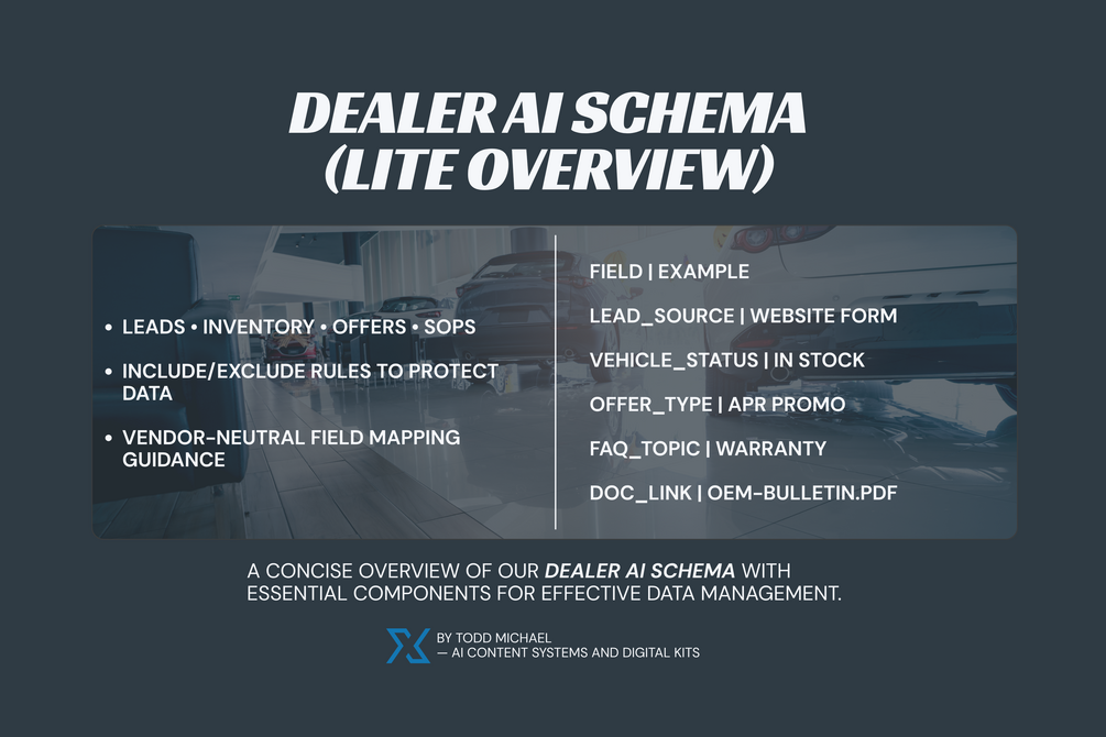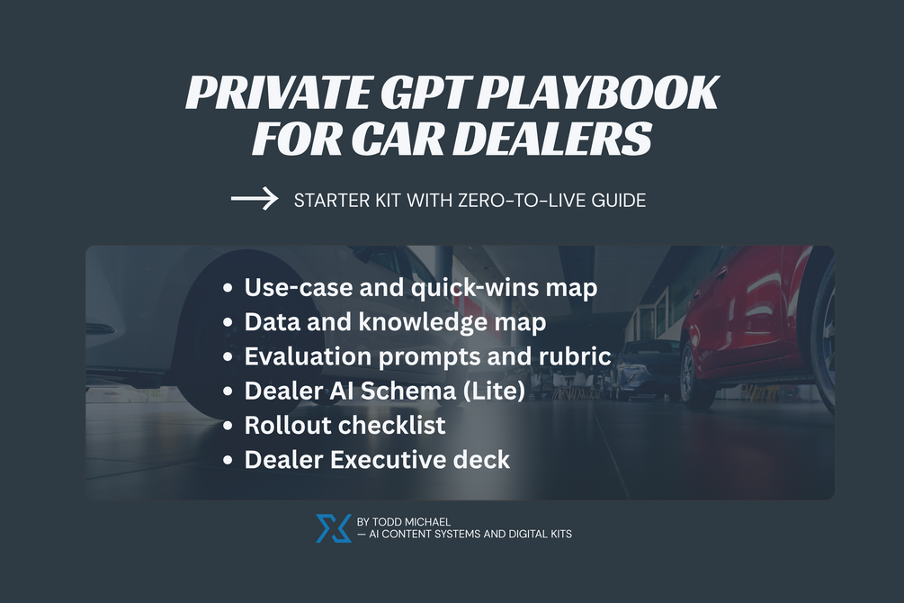 Launch a private, dealership-ready GPT pilot in ~60 minutes: Airtable CSVs, prompts, Zapier flows, evaluation harness, and SMS compliance snippets.