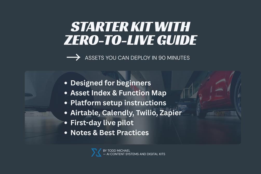 Spin up a two-week Starter Pilot for your car dealership (or SMB) without code. This Starter Kit Edition includes import-ready Airtable schemas, a brand-voice system prompt + guide, 10 conversation starters, a 20-prompt evaluation harness with scoring rubric, Zapier blueprints for SMS follow-ups and appointment reminders, and compliance snippets for fast, safe rollout.